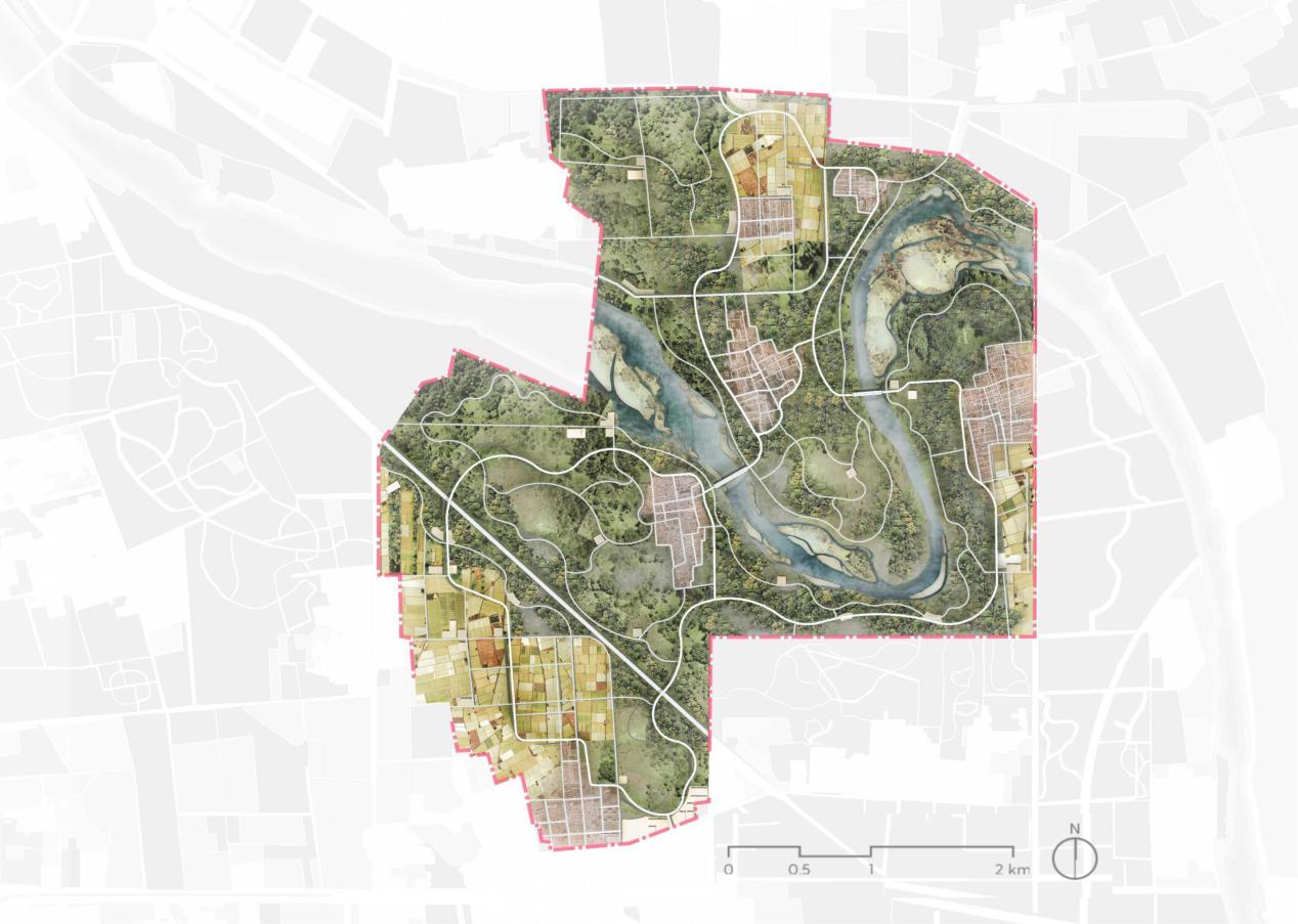 在最终方案的详细设计中,我们依据场地代表性的空间类型,即林、水、田、村四类空间,选择其中具有代表性的点位突出进行鸟类保育和自然教育的相关设计。林水交织的森林探索区作森林节点;具有鸟类保育潜力的湿地组团作湿地节点;林地与村落交融的农田作农田节点;内外人文活动氛围浓厚的西集村作为村庄节点。
