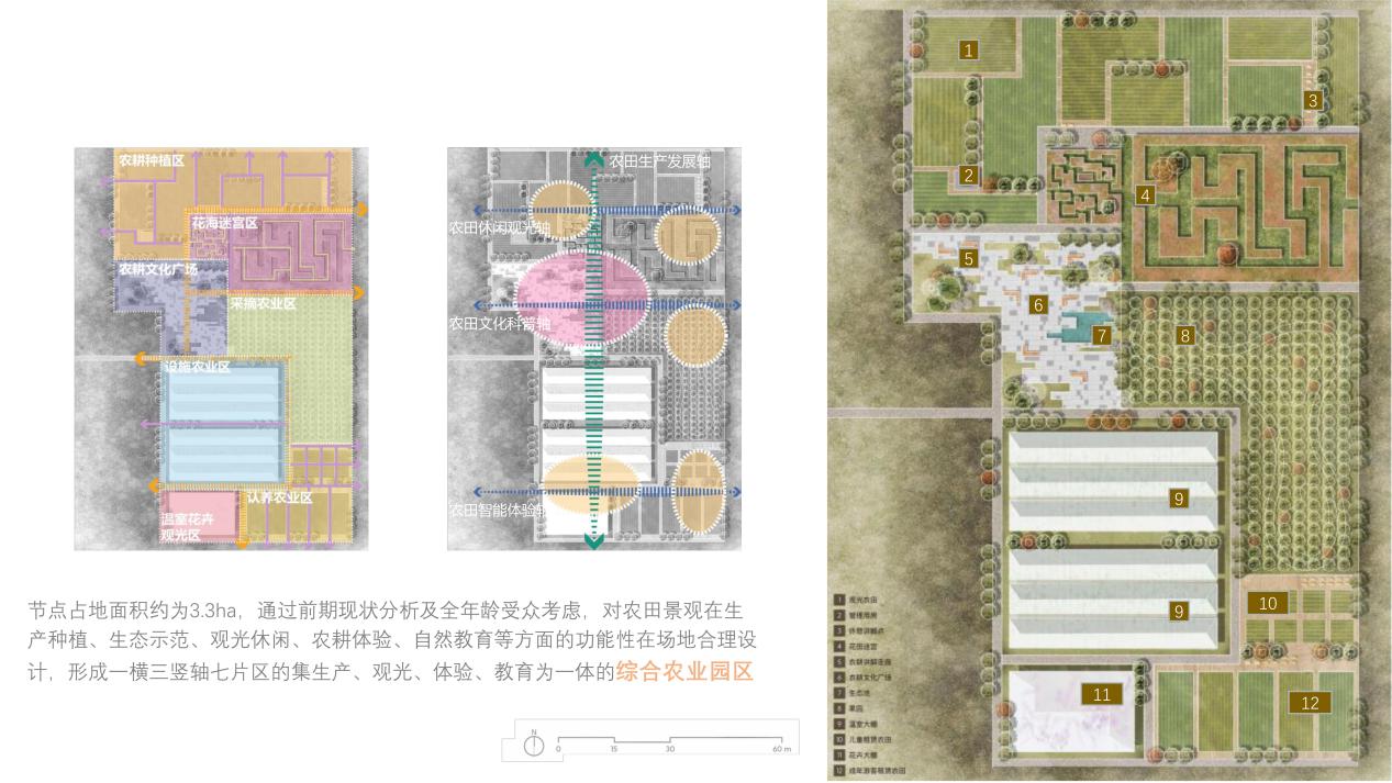 农田节点融入生态示范、观光休闲、农耕体验、自然教育,形成综合农业组团,同时满足游客与农民的需求。通过智慧农业物联网,助力农业监测,提高游客体验。观光-体验-科普一体的发展模式提供沉浸式乡村体验,扩大品牌效应,实现自然教育。
