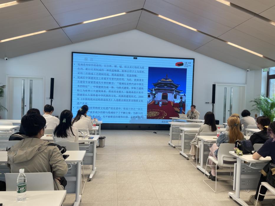 最后在园区的研学中心,球盟会师生聆听蒋建国先生(国家级非物质文化遗产《琉璃烧制》技艺代表性传承人)讲解琉璃生产技艺。琉璃作为中国传统建筑不可或缺的装饰性材料,琉璃的烧制,不仅有大小不同的规制,更对原材料的使用十分严格,而产于琉璃渠的坩子土恰恰是烧制琉璃的最佳原料。这是因为,烧制出来的白色质地,使琉璃色彩更加靓丽,另外坩子土制坯后缩水只有6%,较能保持终极产品与素烧产品的统一性。蒋先生对工具,到琉璃构件的规格尺寸进行了概述讲解,并对传承至今的官式琉璃技艺熊做法、特征和流程进行了详尽介绍,在场师生们深刻体会到官式琉璃烧制技艺的巧妙高深之处。