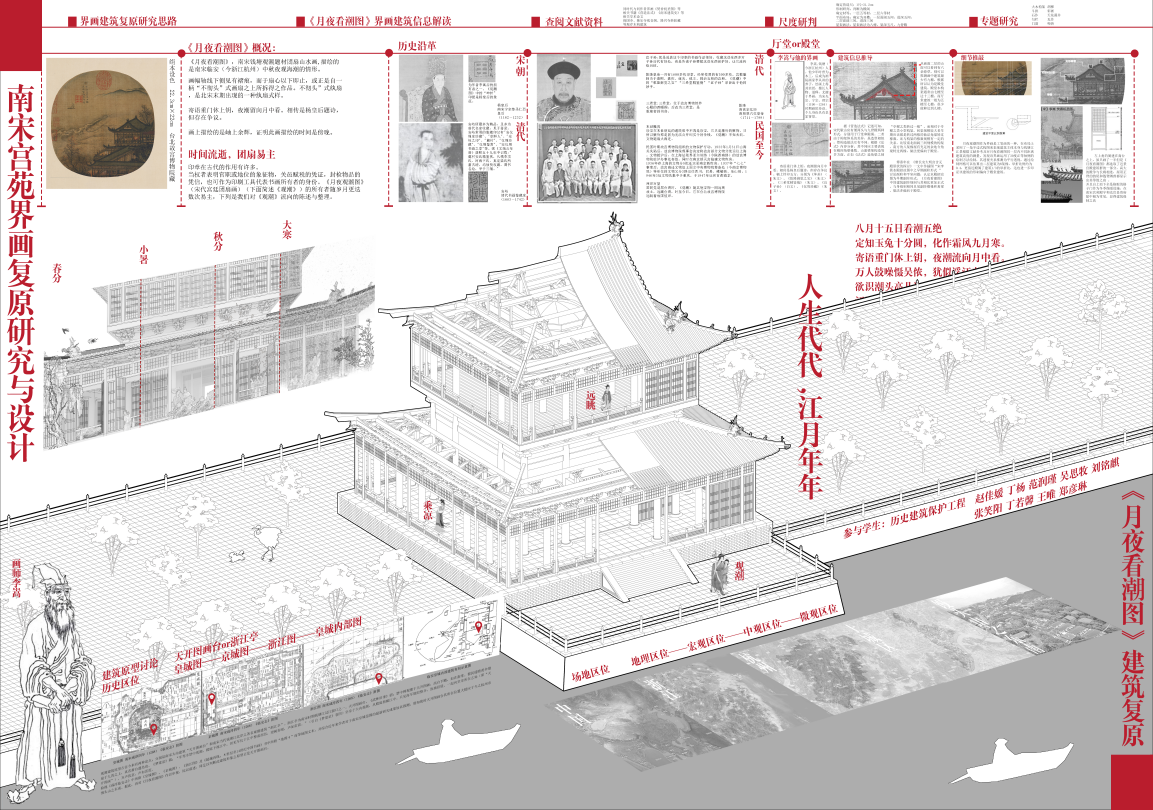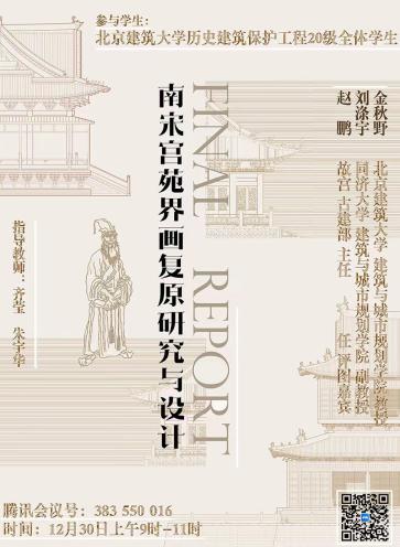 2022年12月30日,球盟会历史建筑保护工程专业古建2020级三年级《南宋宫苑界画复原研究与设计》成果评图会顺利举行。课题以南宋李嵩的《水殿招凉图》、《仙筹增庆图》和《月夜观潮图》三幅古画中所展示的古建筑园林作为研究和复原主体。 课程从研究宋代界画的艺术风格、作者背景和画面构图入手,重点针对画中的宋代古建筑和园林环境。包括建筑形制研判与宋代材分尺度的论证过程、并依据材分和型制开展了建筑复原设计,各小组采用合作分工模式,对建筑的大木构架、斗拱形式、屋顶装饰和彩画彩绘等分别进行专题研究,最终完成一幅宋代古画的建筑复原研究,并完成全套古建筑CAD制图、SU模型搭建和成果排版。最后各组用PPT和动画视频进行了成果的介绍与展示。课程形成了一系列研究设计成果。课程激发了同学们的研究兴趣,并热情参与完成了全部成果的展示。课程的指导教师为齐莹老师、朱宇华老师。