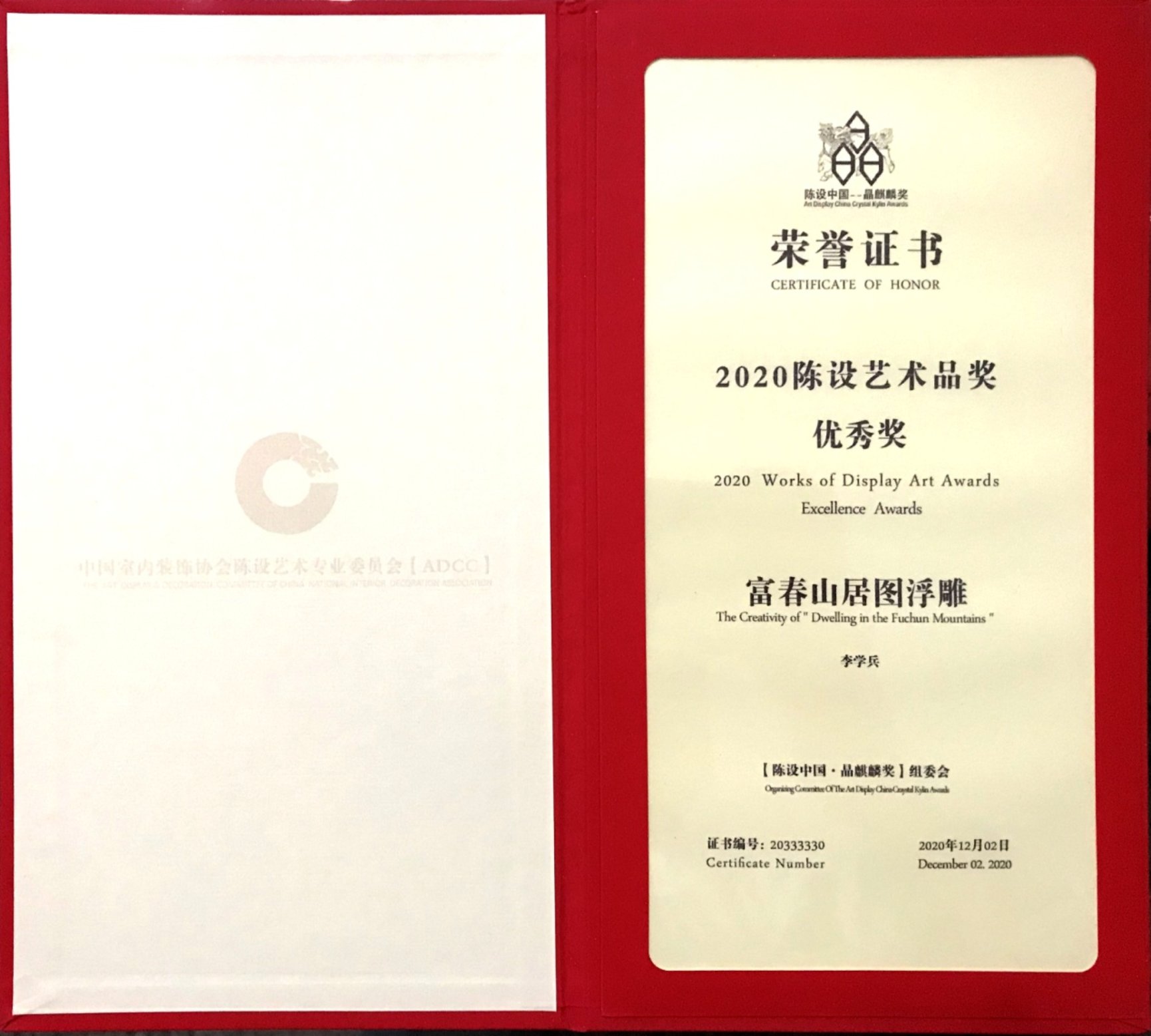 【陈设中国·晶麒麟奖】2020陈设艺术品奖于2020年12月2日揭晓,公司教师李学兵雕塑作品《富春山居图》获得优秀奖。本次获奖作品为大型砂岩浮雕,面积约为320平米,于2016年8月安装竣工于中国建筑总公司首层大堂。作品以元代画家黄公望《富春山居图》中的《剩山图》为蓝本,通过泥塑制模,数据扫描,3D粗模雕刻,人工精雕,最终完成作品。我国传统绘画,借助墨色的浓淡干湿,以及笔法的皴擦点染体现山水浩渺意境,是以虚写实;雕塑则是利用起位叠压、体面转折、虚实处理去追寻原作精神,可谓以实写虚。该作品是以现代材料加工手段对传统经典绘画的“转译”,也是以浮雕表现山水意境的有益尝试。