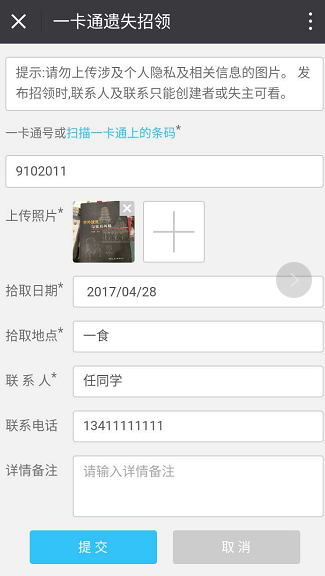 捡到了校园卡后只需输入卡号就可以通知失主哦